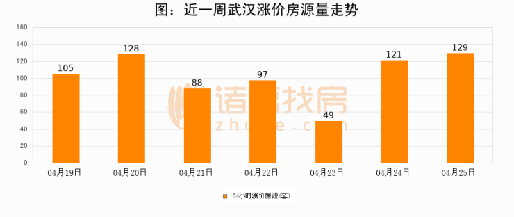 根据诸葛找房数据显示,武汉24小时涨价房源量为129套,较04月24日增加8套,环比上涨6.6%。与此同时,涨价房源占比小幅扩大,业主信心有所提升。