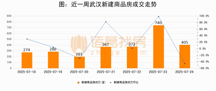 根据武汉市住房保障和房屋管理局数据显示,2025年07月24日武汉新建商品房成交405套,较昨日减少335套,环比下降45.3%