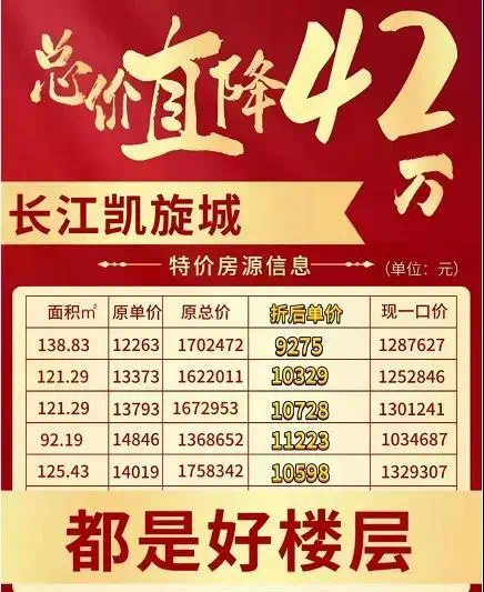 今年11月,长江凯旋城推出了限时特惠房,单价低至9275元/㎡,首付33万起,还都是好楼层。较之4年前,房价不涨反跌。