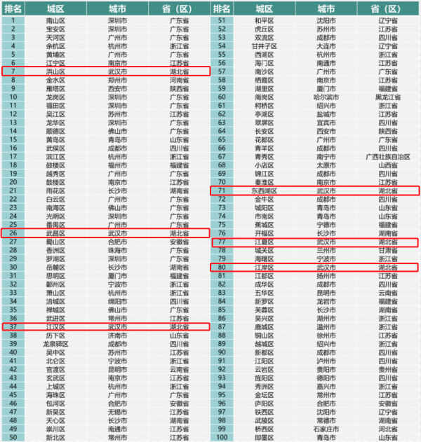 其中,洪山区位居百强区第7位;武昌区位居第26位;江汉区位居第37位;东西湖区位居第71位;江夏区位居第77位;江岸区位居第80位;武昌区位居第26位。