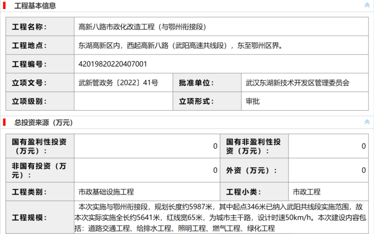高新八路改造化工程(鄂州衔接段)是西起高新八路(武阳高速共线段),东至鄂州区界,本次实施与鄂州衔接段,规划长度约5987米,其中起点346米已纳入武阳共线段实施范围,故本次实际实施全长约5641米,红线宽65米,为城市主干路,设计时速50km/h。