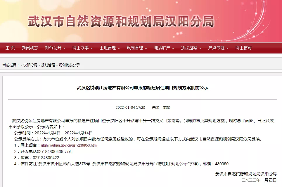 1月4日消息,搜狐焦点获悉,近日,武汉市自然资源和规划局汉阳分局发布-武汉洺悦领江房地产有限公司申报的新建居住项目规划方案批前公示。