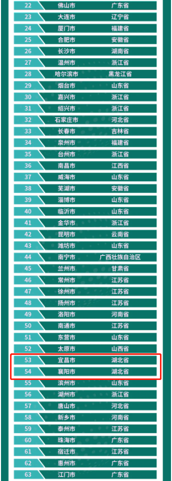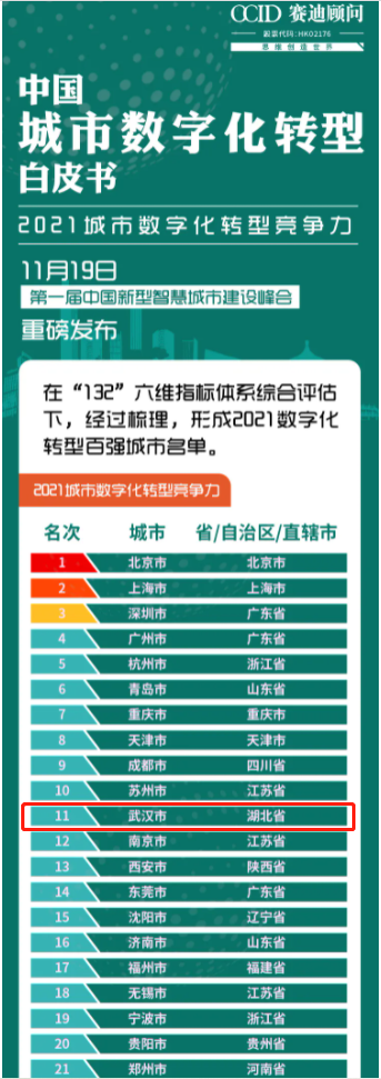 11月21日,搜狐焦点获悉,近日,在排名前列届中国新型智慧城市建设峰会上发布了《2021年中国城市数字化转型竞争力》评估结果,公布了“2021数字化转型百强城市名单”。榜单显示,湖北三地上榜,其中武汉居全国第11位,宜昌53位,襄阳54位。