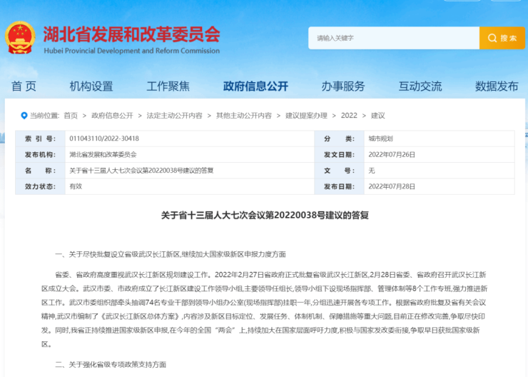 10月8日消息,搜狐焦点获悉,近期,湖北省发改委就高级长江新区,相关申报推进情况做出答复。
