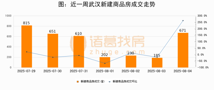 根据武汉市住房保障和房屋管理局数据显示,2025年08月04日武汉新建商品房成交671套,较昨日增加486套,环比上涨262.7%