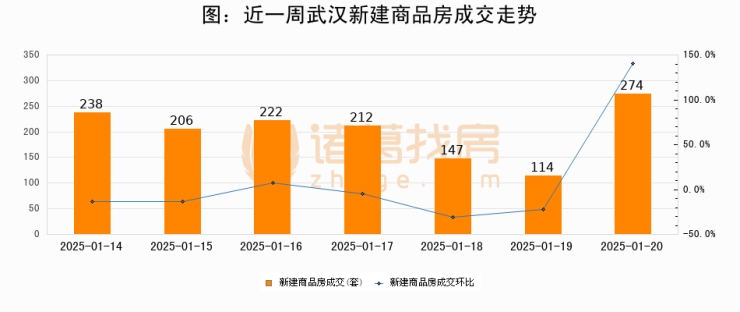根据武汉市住房保障和房屋管理局数据显示,2025年01月20日武汉新建商品房成交274套,较昨日增加160套,环比上涨140.3%