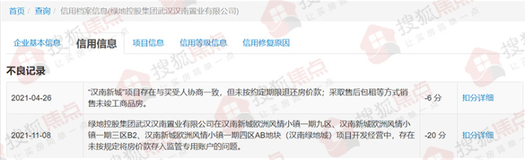 绿地控股集团武汉汉南置业有限公司则分别于2021年4月26日、2021年11月8日被扣分,扣分原因包括:未按约定期限退还房价款、采取售后包租等方式销售未竣工商品房、未按规定将房价款存入监管专用账户等问题。