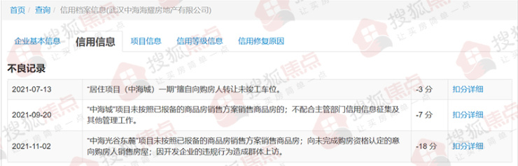 从名单中可以看出,中海、绿地等知名房企赫然在列。搜狐焦点查询获悉,武汉中海海耀房地产有限公司分别于2021年7月13日、2021年9月20日以及2021年11月2日被扣分,扣分原因包括:擅自向购房人转让未竣工车位、未按照已报备的商品房销售方案销售商品房、未按照已报备的商品房销售方案销售商品房、向未完成购房资格认定的意向购房人销售房屋、因开发企业的违规行为造成群体上访等。