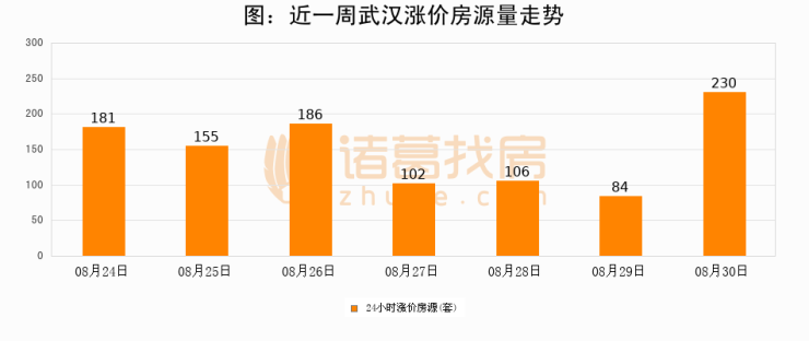 根据诸葛找房数据显示,武汉24小时涨价房源量为230套,较08月29日增加146套,环比上涨173.8%。与此同时,涨价房源占比小幅扩大,业主信心有所提升。