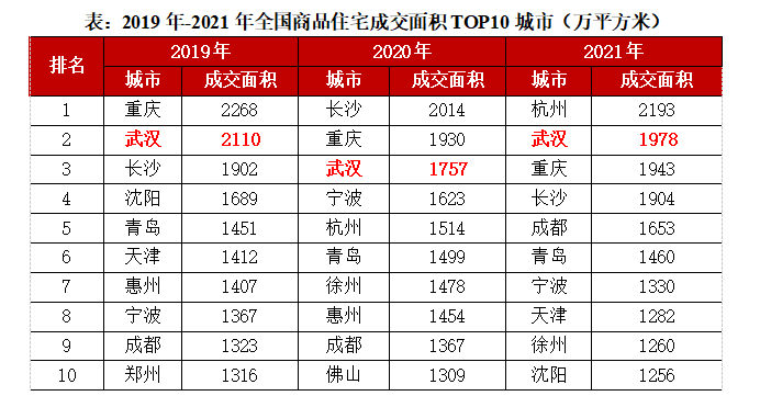2020年,受疫情影响,武汉全年新房成交面积缩量至1757万平方米,但排名仍高居全国第3位。