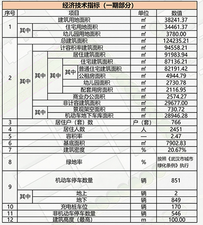 经济技术指标显示,一期建筑用地面积38241.37㎡,其中住宅用地34461.37㎡,幼儿园用地3780㎡,总建筑面积124235.21㎡,其中普通住宅建面82191.42㎡,公租房面积4944.79㎡,商业办公2574.27㎡。
