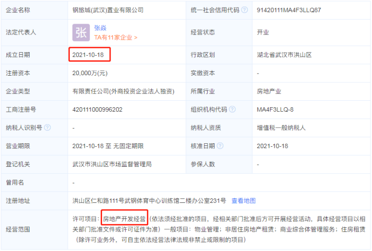 资料显示,2022年3月钢旅城(武汉)置业有限公司获得增资,投资方为武钢集团有限公司,投资金额7.64亿元,持股比例49.8%。该项目由武钢集团与港中旅联合开发武钢大厦二期项目,成为武钢集团转型产业园区业的重点项目,其整体规划开发将有效盘活武钢集团存量不动产资源,既为武钢集团存量土地的开发开辟了路径,也为武钢集团全流程操盘地产项目开发建设提供了锻炼机会,项目策划、立体招商、项目管理、先进服务、资本运营等五大关键能力有望在实战中得以锤炼,将有力支撑武钢集团产业园区业高质量转型发展。