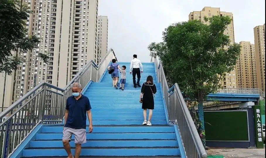 记者在现场见到人行天桥的两边都是密集的居民区一侧有小学、有轨电车车站另一侧正在新建一所中学天桥的拉通大大改善了周边的出行特别是上学的出行时值中午,仍然不断有行人从蓝色系的天桥上穿行