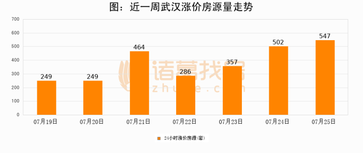 根据诸葛找房数据显示,武汉24小时涨价房源量为547套,较07月24日增加45套,环比上涨9%。与此同时,涨价房源占比小幅扩大,业主信心有所提升。