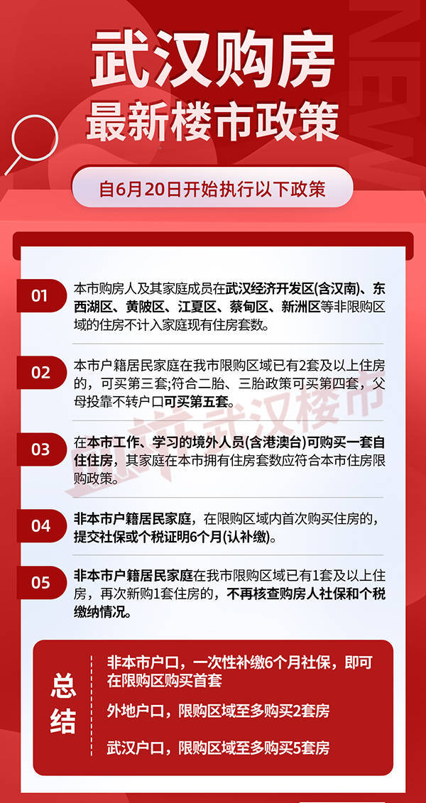 总结来看,截止发稿前,武汉市8大主城区中,除了武昌区和东湖高新技术开发区尚未接到新政通知外,非武汉户籍人员在其余6个主城区只要补缴6个月社保,即可购房。