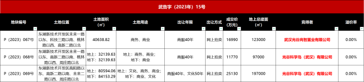 P(2023)068和P(2023)069号两宗地,由光谷科学岛(武汉)有限公司竞得。