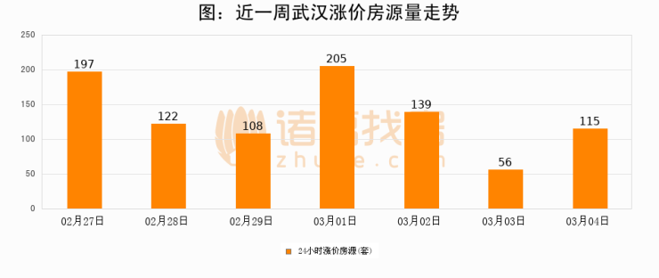 根据诸葛找房数据显示,武汉24小时涨价房源量为115套,较03月03日增加59套,环比上涨105.4%。与此同时,涨价房源占比小幅扩大,业主信心有所提升。