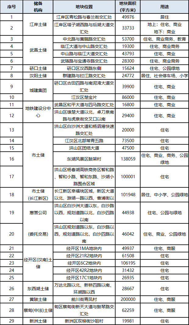 12月4日,武汉发布第五批供地清单,共计29宗地,其中经开区5宗地、洪山区6宗地、武昌区5宗地,江汉区、江岸区、硚口区各2宗地,东西湖区、东湖风景区、黄陂区、新洲区、蔡甸区、长江新区、汉阳区各1宗地。