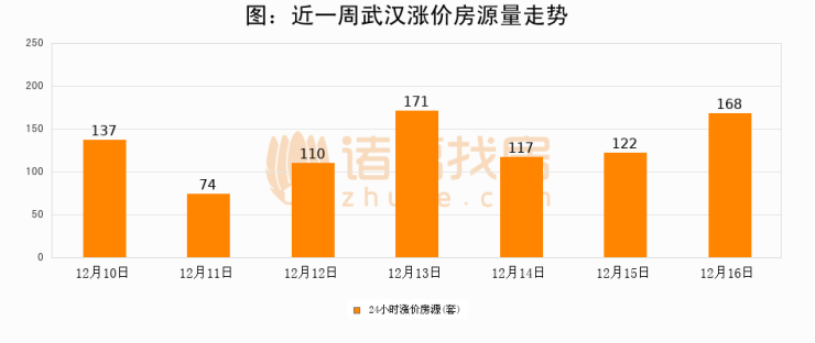 根据诸葛找房数据显示,武汉24小时涨价房源量为168套,较12月15日增加46套,环比上涨37.7%。与此同时,涨价房源占比小幅扩大,业主信心有所提升。