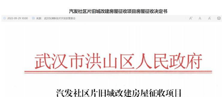 9月29日,东湖高新区人民政府发布了汽发社区片旧城改建房屋征收项目房屋征收决定书,并在11月发布了汽发社区片旧城改建房屋征收项目协商选定房地产价格评估机构结果的公告。