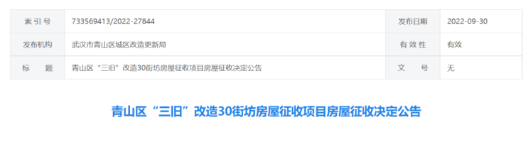 青山区人民政府发布了 青山区“三旧”改造30街坊房屋征收项目房屋征收决定书、决定公告。