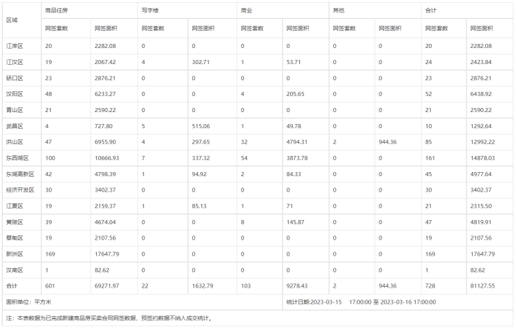 根据武汉市住房保障和房屋管理局数据显示,2023年03月16日武汉新建商品住房网签成交601套, 较昨日增长192套,环比上涨47%。