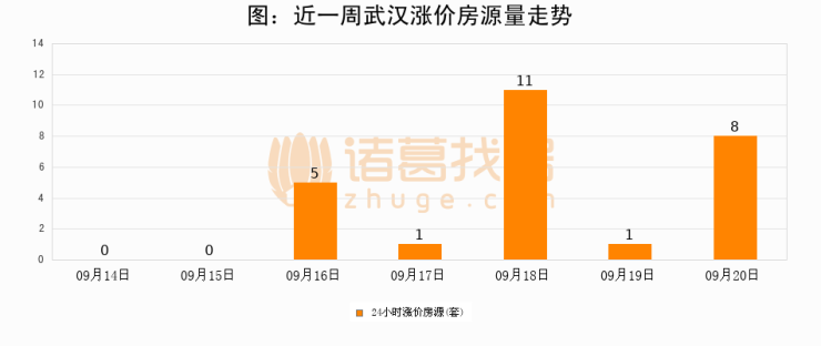 根据诸葛找房数据显示,武汉24小时涨价房源量为8套,较09月19日增加7套,环比上涨700%。与此同时,涨价房源占比小幅扩大,业主信心有所提升。