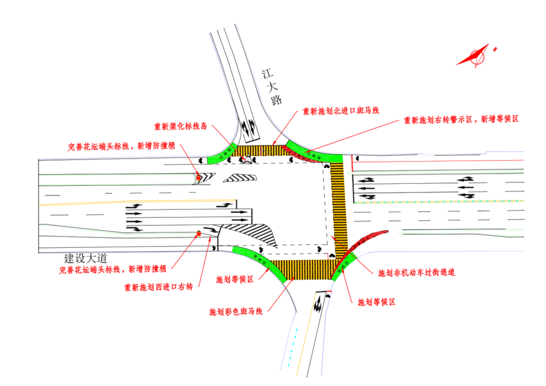 建设大道江大路的西进口和西出口的护栏端头,将增加施划导流线,新增防撞桶;根据车流轨迹,重新渠化北进口标线岛,给出东进口直行进辅道的空间;重新施划东北角右转警示区,给出等候区空间。