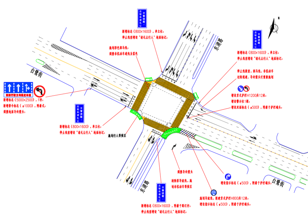武昌区的东湖路白鹭街将禁止东西方向左转,在人行道上施划行人等候区,过街斑马线变彩色,各进口新增右转车辆礼让行人标牌,施划“请礼让行人”地面标记;东出口加油站位置新增导向线和护栏。