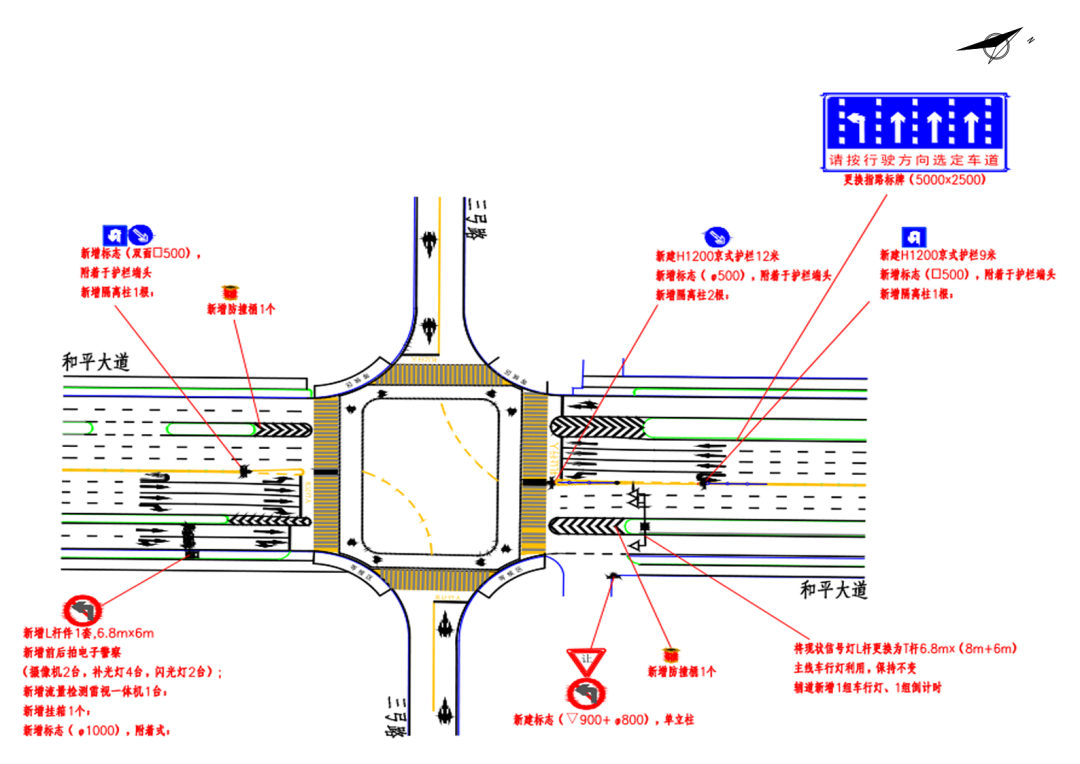 和平大道建设四路的东、西进口将更换人行信号灯;南、北进口停止线后移,完善标线;东西方向绿化带端头增设防撞桶;东西方向中央护栏端头增设靠右行驶标牌等。