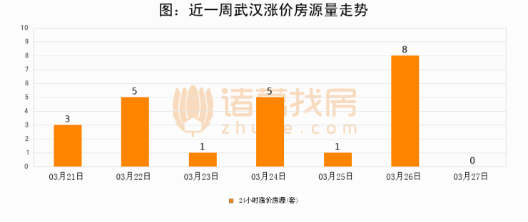 根据诸葛找房数据显示,武汉24小时涨价房源量为0套,较03月26日减少8套,环比下降100%。与此同时,涨价房源占比小幅回落,对于购房者来说是一个入市窗口期,购房者可抓住时机入市。
