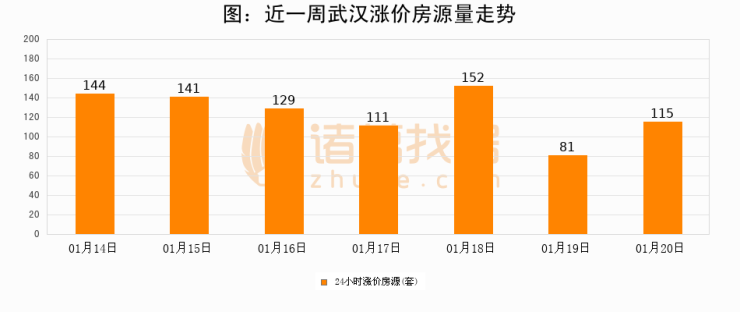 根据诸葛找房数据显示,武汉24小时涨价房源量为115套,较01月19日增加34套,环比上涨42%。与此同时,涨价房源占比小幅扩大,业主信心有所提升。