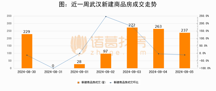根据武汉市住房保障和房屋管理局数据显示,2024年09月05日武汉新建商品房成交237套,较昨日减少26套,环比下降9.9%。近一周武汉新建商品房日均成交161套。09月05日单日成交237套,高于近一周平均水平47.2%。