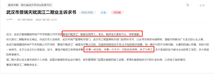 由武汉盈锦嘉园房地产开发有限公司开发的“景瑞天赋滨江”楼盘自开售之日起,负面新闻就层出不穷:从开始的欺诈销售、到一期交付的不合格问题,从最初的满心欢喜,到如今的一地鸡毛,无不让业主们心惊胆战,如今,景瑞天赋滨江依然继承着“好事一件没有,坏事一个不少”的优良传统,来了个停工。多少家庭的血汗被冷冰冰的停工冻结,多少家庭的希望破灭。现二期大部分业主请求有关部们介入协调,监管此楼盘的资金运行情况,相关管理部门监管此楼盘的施工进展,审查此楼盘验收交付的行业标准、以及竣工验收情况。