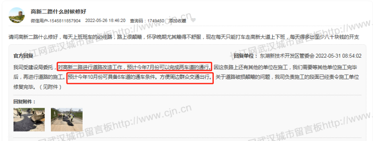 对此,东湖新技术开发区管委会回复称:我司受建设局委托,对高新二路进行道路改造工作,预计今年7月份可以完成两车道的通行。因这条路上还有其他的单位在施工,我们需要等其他单位施工完毕后,再进行道路的施工。预计今年10月份可具备8车道的通车条件。方便周边群众交通出行。关于道路破损颠簸的问题,我司负责施工的段面已经责令施工单位修复完毕。