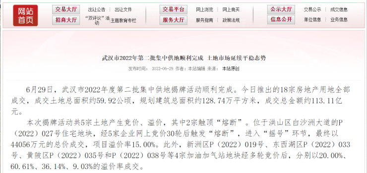 18宗地斩获113亿!武汉2022年第二轮土拍收官 5宗地块溢价成交