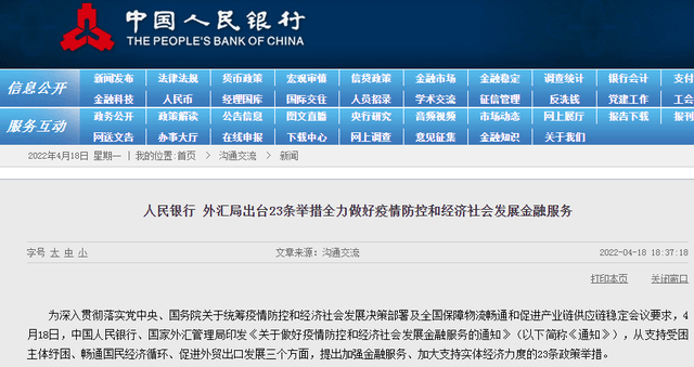 4月18日,中国人民银行、国家外汇管理局印发《关于做好疫情防控和经济社会发展金融服务的通知》(以下简称《通知》),从支持受困主体纾困、畅通国民经济循环、促进外贸出口发展三个方面,提出加强金融服务、加大支持实体经济力度的23条政策举措。