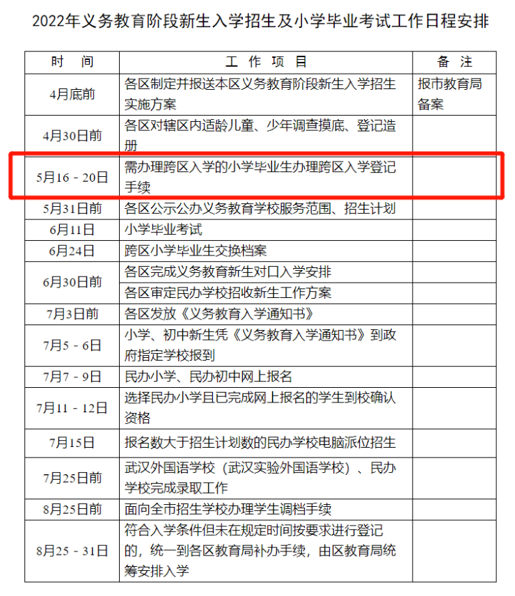 按照武汉市教育局发布2022年武汉义务教育新生入学政策其中明确,5月16-20日需办理跨区入学的小学毕业生办理跨区入学登记手续,有意向报考武汉公参民初中的学生家长,如果学籍不在对应区家长需要在在规定时间内依照流程办理。