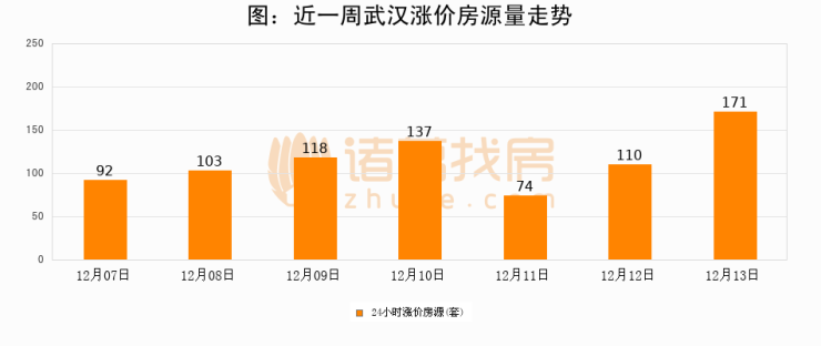 根据诸葛找房数据显示,武汉24小时涨价房源量为171套,较12月12日增加61套,环比上涨55.5%。与此同时,涨价房源占比小幅扩大,业主信心有所提升。