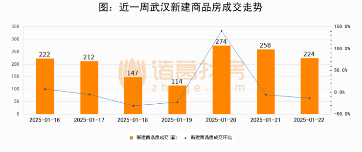 根据武汉市住房保障和房屋管理局数据显示,2025年01月22日武汉新建商品房成交224套,较昨日减少34套,环比下降13.2%。近一周武汉新建商品房日均成交208套。01月22日单日成交224套,高于近一周平均水平7.7%。