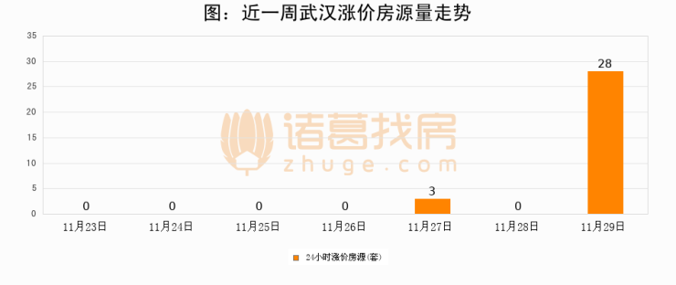 根据诸葛找房数据显示,武汉24小时涨价房源量为28套,较11月28日增加28套,环比上涨0%。与此同时,涨价房源占比小幅扩大,业主信心有所提升。