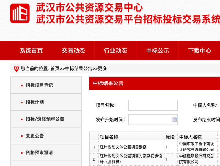 公告显示,项目勘察中标单位为中国市政工程中南设计研究总院有限公司,中标工期30天。项目方案及初步设计(含概算)中标单位为中信建筑设计研究总院有限公司,中标工期45天。