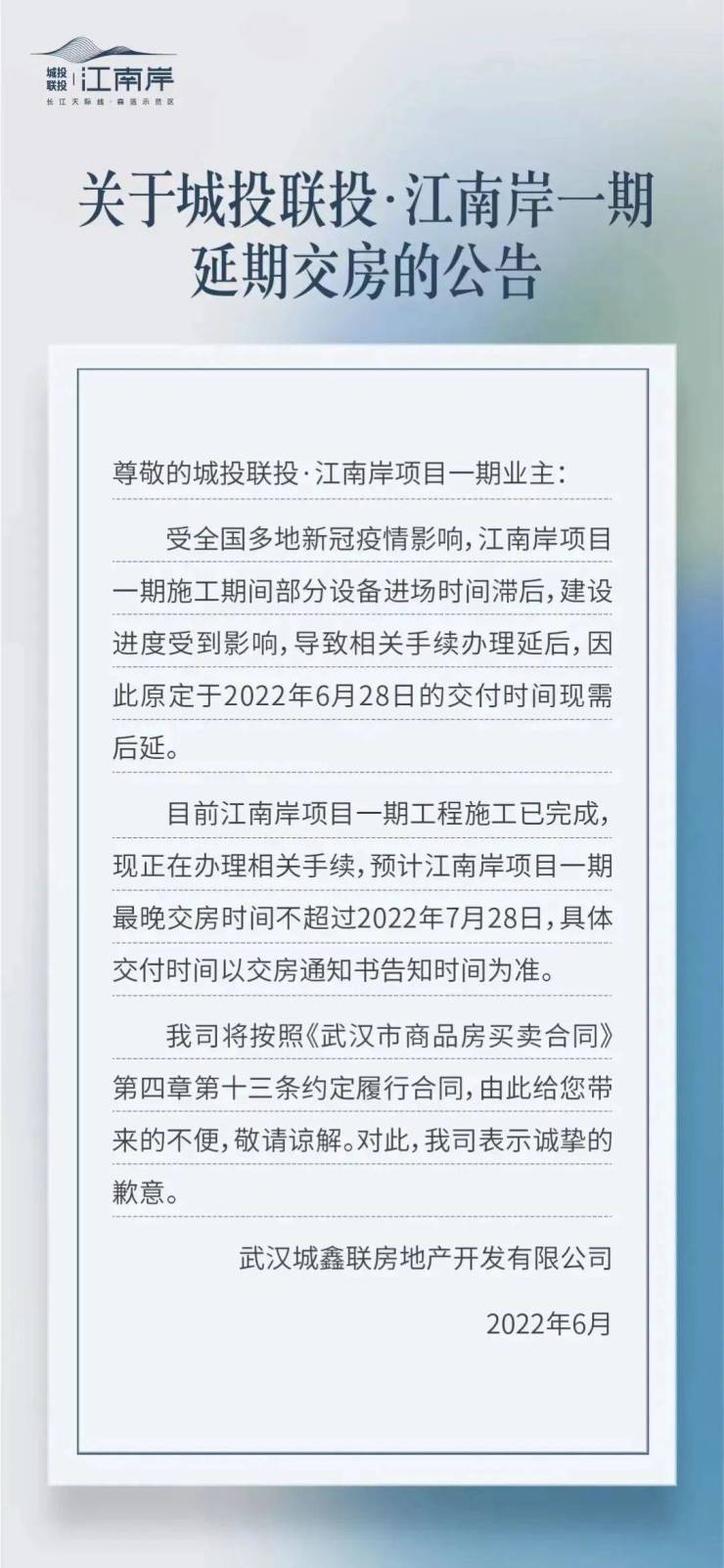 6月26日,城投联投江南岸官微发布延期交房公告。