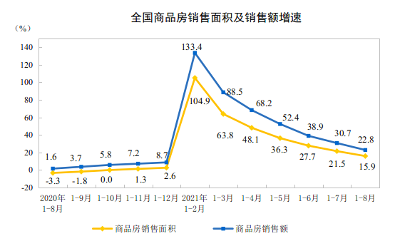 在销售端,国家统计局统计数据显示,今年1-8月,全国商品房销售面积约为11.42亿平方米,同比增长15.9%;比2019年1-8月增长12.1%,两年平均增长5.9%。其中,住宅销售面积同比增长16.5%,办公楼销售面积同比增长3.7%,商业营业用房销售面积同比增长2.1%。今年1-8月,全国商品房销售额约为11.9万亿元,同比增长22.8%;比2019年1-8月增长24.8%,两年平均增长11.7%。其中,住宅销售额同比增长24.5%,办公楼销售额同比增长3.5%,商业营业用房销售额同比增长3.3%。