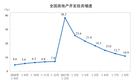 9月15日,国家统计局发布的《2021年1-8月份全国房地产开发投资和销售情况》显示,今年1-8月,全国房地产开发投资约9.80万亿元,同比增长10.9%,这是房地产开发投资增速连续第6个月增幅收窄。