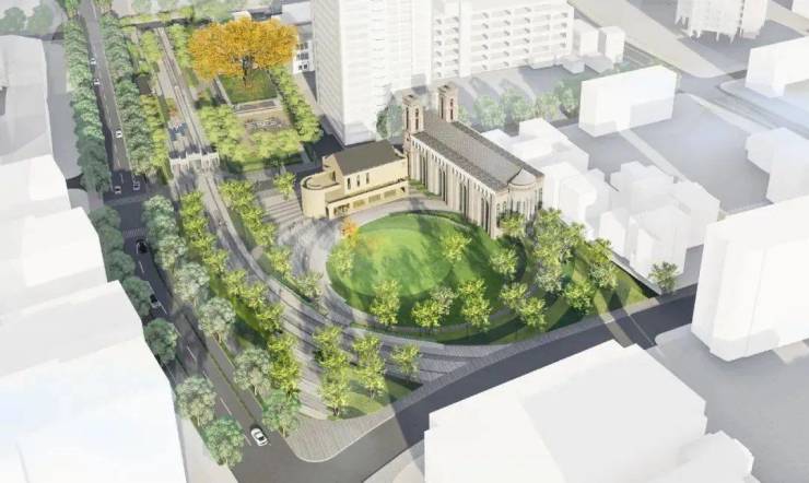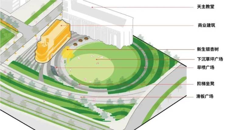 该空间周围有天主教堂,旱喷广场、滑板广场、阶梯坐凳、新生银杏树等景观,保持了城市空间环境的整体与和谐。