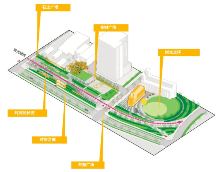 南广场设计大型下沉圆形草坪广场作为“时光之环”,与时空走廊相互呼应,响应大归元片二期“古今交融”的整体理念。