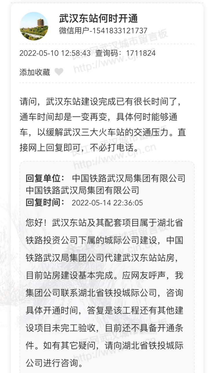 除了武汉东站能否更名,还有很多网友关心武汉站的建设进度,中国铁路武汉局集团有限公司在5月15日也回复了网友: