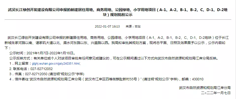 1月17日消息,搜狐焦点获悉,近日,武汉市自然资源和规划局江岸分局对外公示武汉长江绿创开发建设有限公司申报的新建居住用地、商务用地、公园绿地、小学用地项目(A-1、A-2、B-1、B-2、C、D-1、D-2地块),地块位于长江新城朱家河路以南、谌家矶大道以北、滠水河东路以东、兴盛路以西。