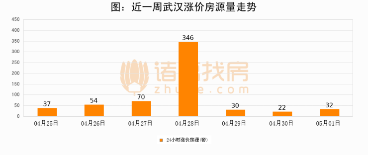 根据诸葛找房数据显示,武汉24小时涨价房源量为32套,较04月30日增加10套,环比上涨45.5%。与此同时,涨价房源占比小幅扩大,业主信心有所提升。